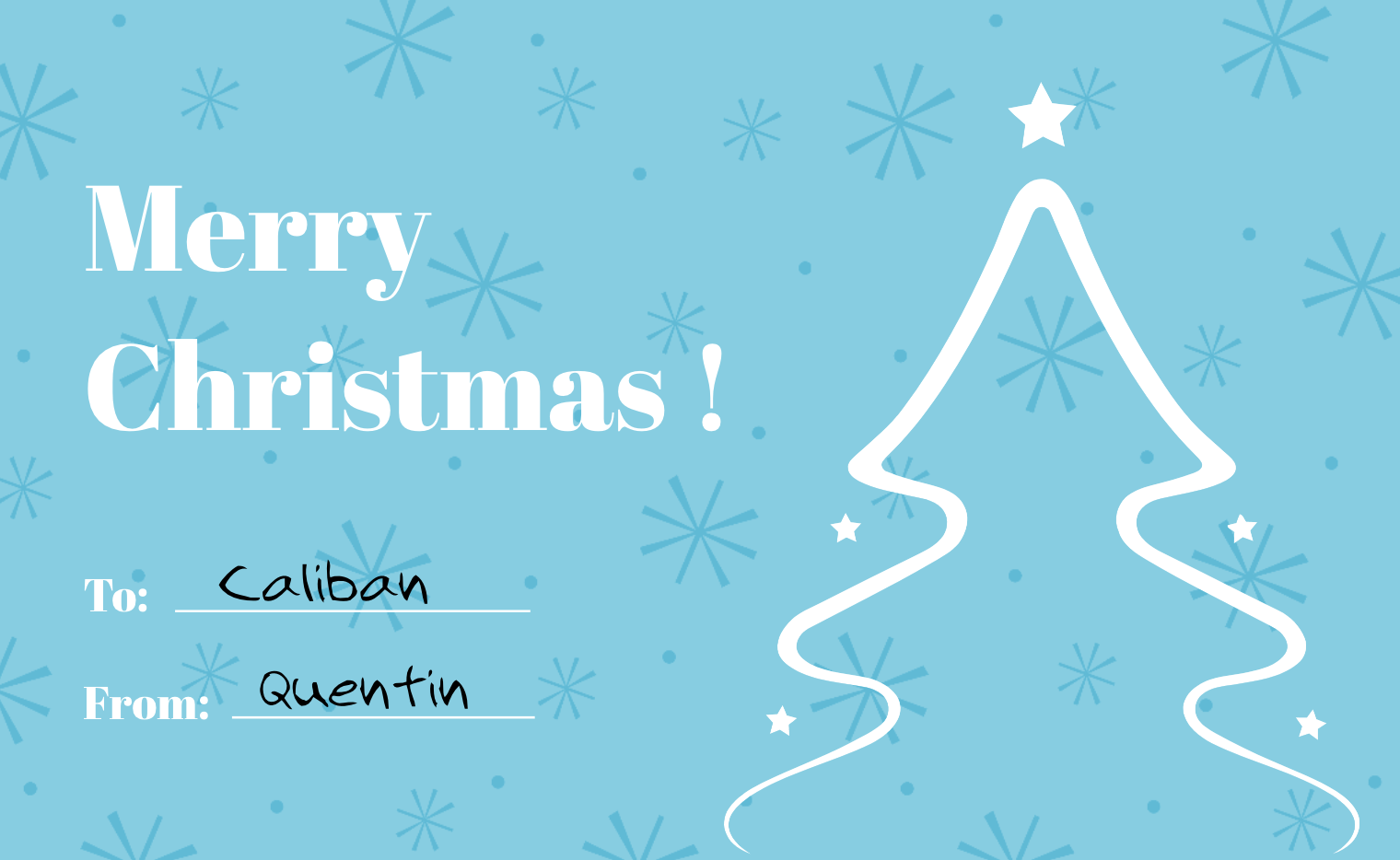 [On Christmas Eve, a package is delivered to Caliban's door. It's a box, wrapped...somewhat clumsily, but it contains a box of alcohol-filled chocolates and a book about Duplicity's magical theory. There's no note, but there's a tag on the wrapping paper.]
